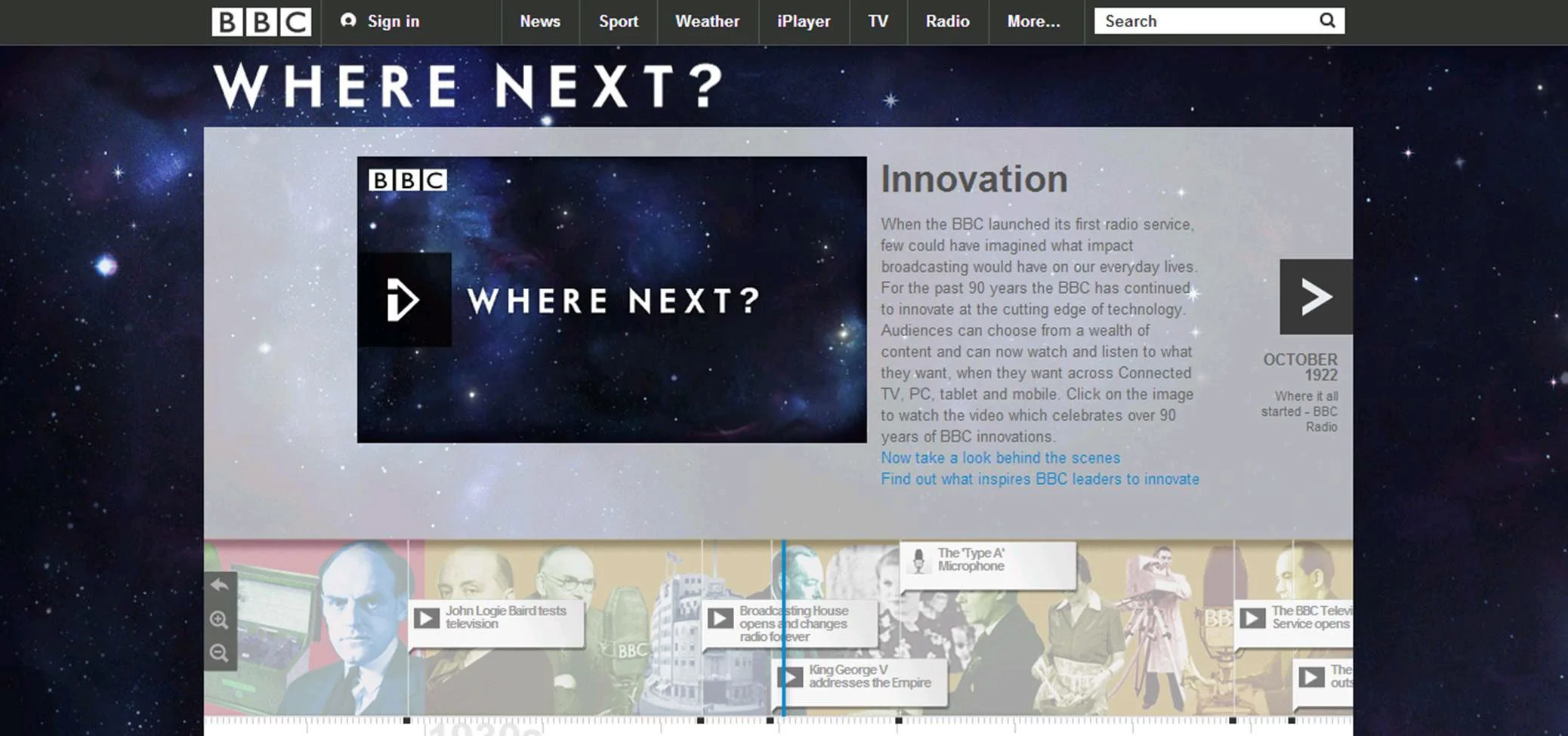 Where Next? showcased the BBC’s commitment to innovation for public benefit throughout its 90 year history. Drawing on archival BBC footage and through partnership with Aardman, The Mill and the BBC Radiophonic Workshop, the launch film celebrates the national broadcaster’s many and varied creative and technological milestones.